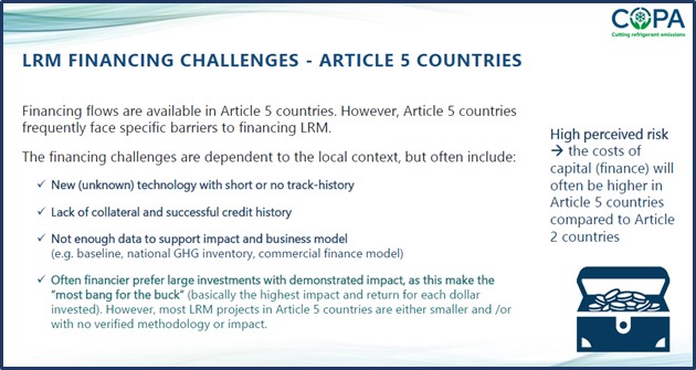 The first presentation focused on available LRM financing options through the lens of financing from public, private and public-private-mixes. The second COPA presentation brought up the importance of refrigerant analysis for an efficient LRM implementation.