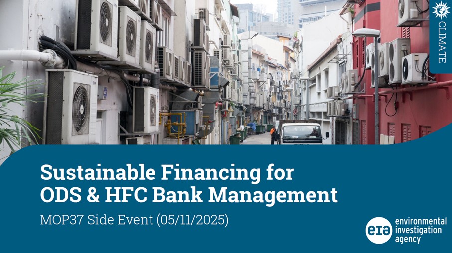 The Environmental Investigation Agency (eia) hosted a side-events with focus on sustainable financing soltuions: "Sustainable Financing for ODS & HFC Bank Managmenet". The initial results from the eia report on "Evaluating Options for Sustainable Finance Action on ODS and HFC Banks", to be published soon, was presented. The outcome of the COPA Study on Global Banks of ODS and HFC (published earlier this year) was presented by Ellen Michel, Head of COPA Secretariat, in this session too. View all Presentation slides here! (pdf)